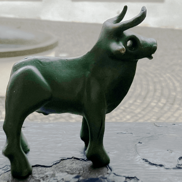 Popis originálu: Bronzová figurka domestikovaného býka je dutá, na spodní straně břicha je trojúhelníkovitý otvor, oční dutiny byly patrně vyplněny sklem, na čele a na bocích byly vsazeny železné trojúhelníkovité vložky, železný proužek procházel i hřbetní linií a byl patrně zakončen ocasem. Dochovaný nýtek na levé zadní noze dokazuje, že figurka byla původně připevněna k jiném předmětu.